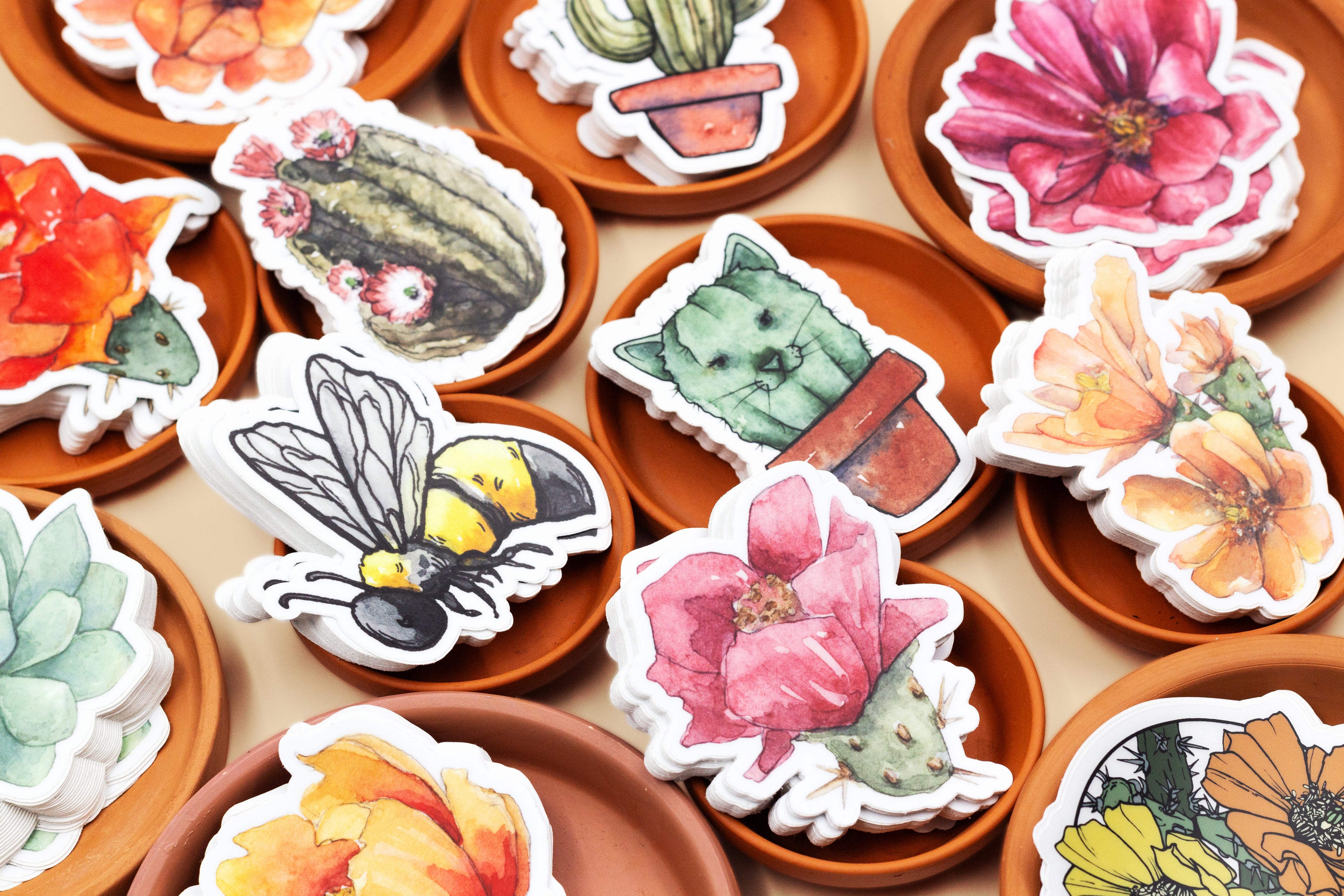 All stickers are created by the team here at Cacti Oasis. We print and cutdown all our stickers in-house. Quality, durable and made with love.
